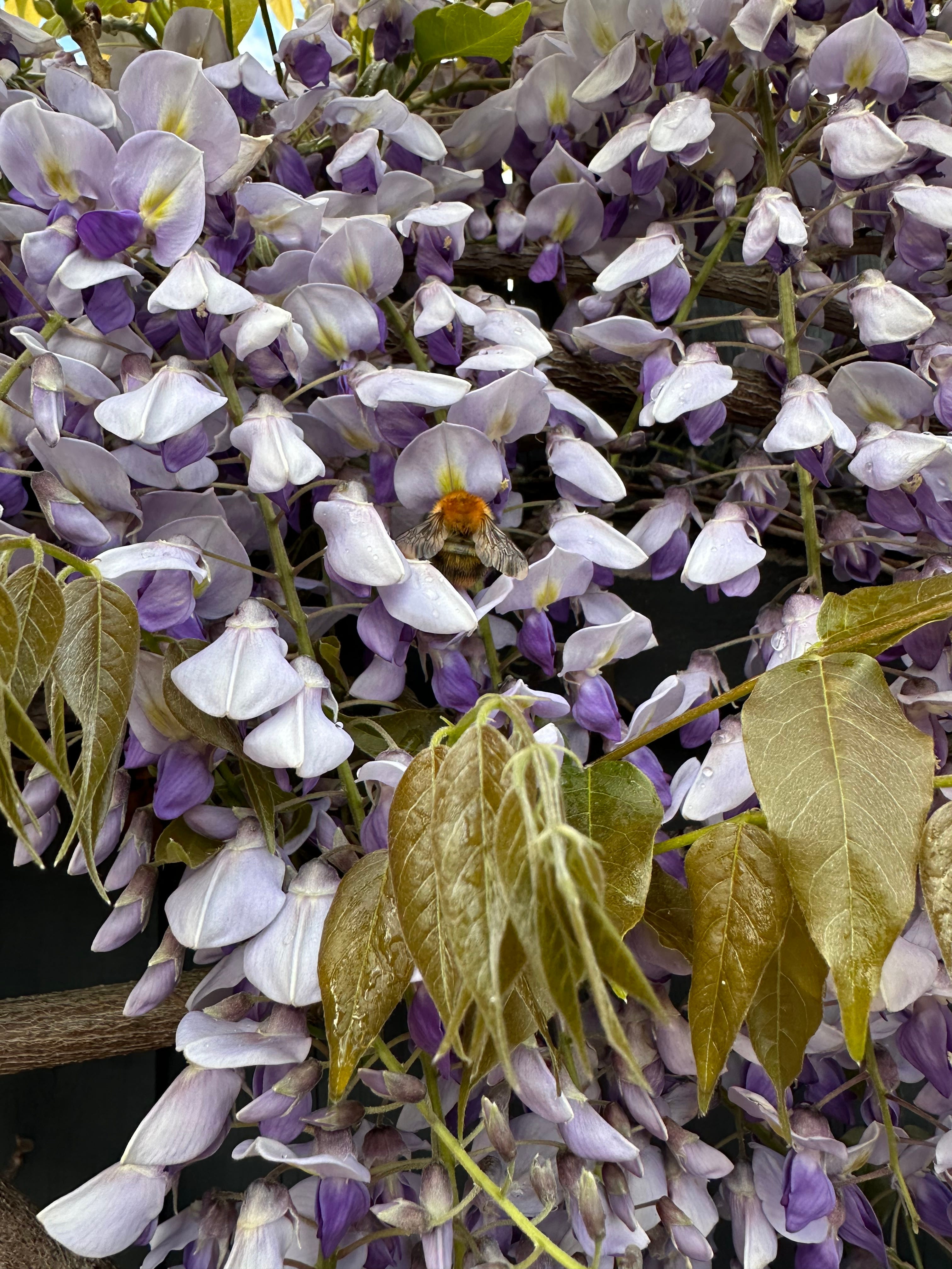 This week there was the added bonus of being greeted by a carpet of delicate bluebells, one of the highlights of the natural year for me. My wisteria is also in full bloom in the garden and for the first time I’ve noticed how wonderful it smells and what a haven for bees it is.